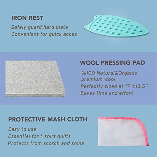 ✔️TWO BONUS ITEMS, a mesh material which helps PROTECT your materials from scorching and shines. An iron relaxation to have an accessible place to REST YOUR IRON. COLORS MAY VARY