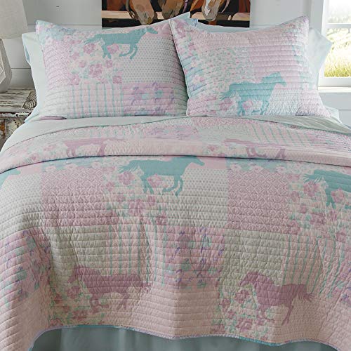 Quilt has an all-over purple, turquoise, and pink printed patchwork pattern of horses, flowers, stripes and dots. Sheet sets and bedskirt are a turquoise and white dot pattern.